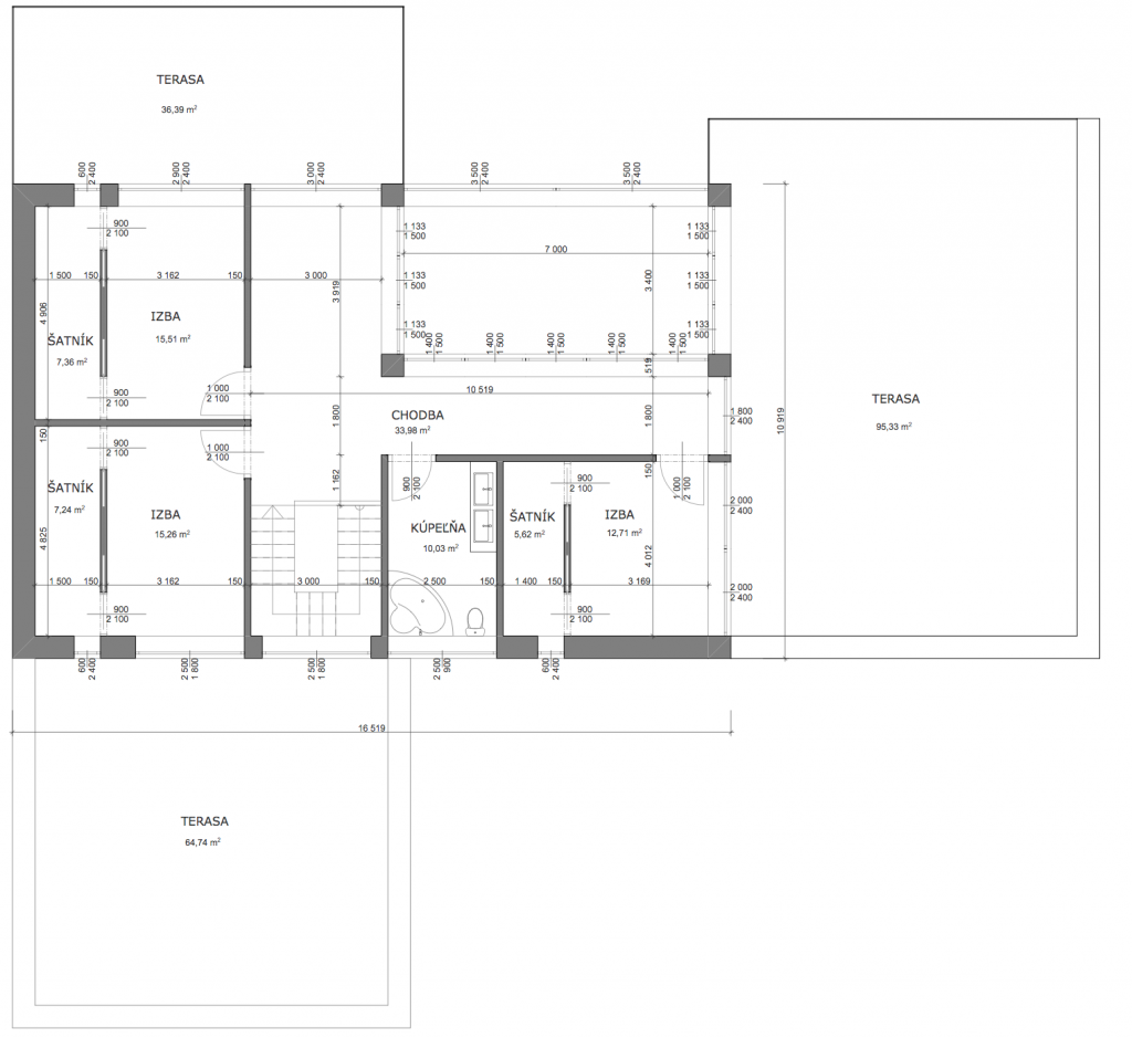 Súkromná časť domu je na druhom nadzemnom podlaží, kde sa nachádzajú 3 veľkoryso riešené izby s vlastnými šatníkmi a jedna priestranná kúpeľňa. Z izieb je možnosť sa dostať na obrovské terasy, ktoré majú rozlohu bytu. Súkromnú časť domu od verejnej časti oddeľuje pravotočivé schodisko.